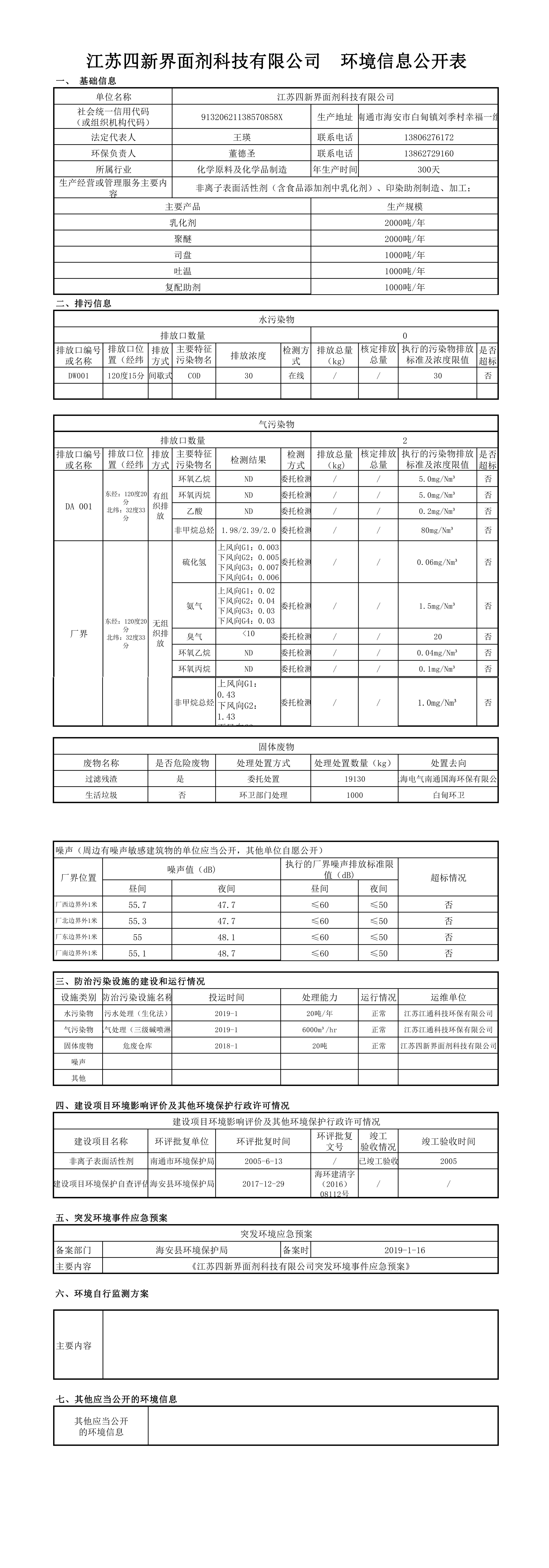 / 江蘇四新界面劑科技有限公司環境信息公開表2020年7月